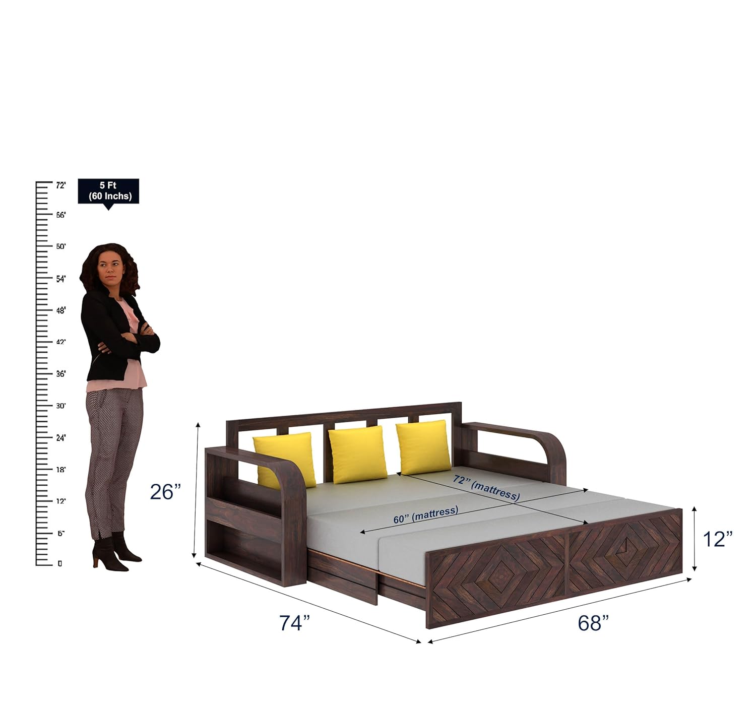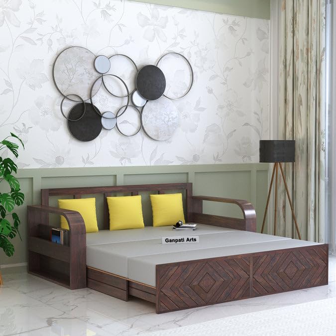 Ganpati Arts Solid Sheesham Wood Wave 3 Seater Sofa Cum Bed with Footboard and Side Pockets for Storage Wooden Sofa Furniture for Living Room Home (Walnut Finish)
