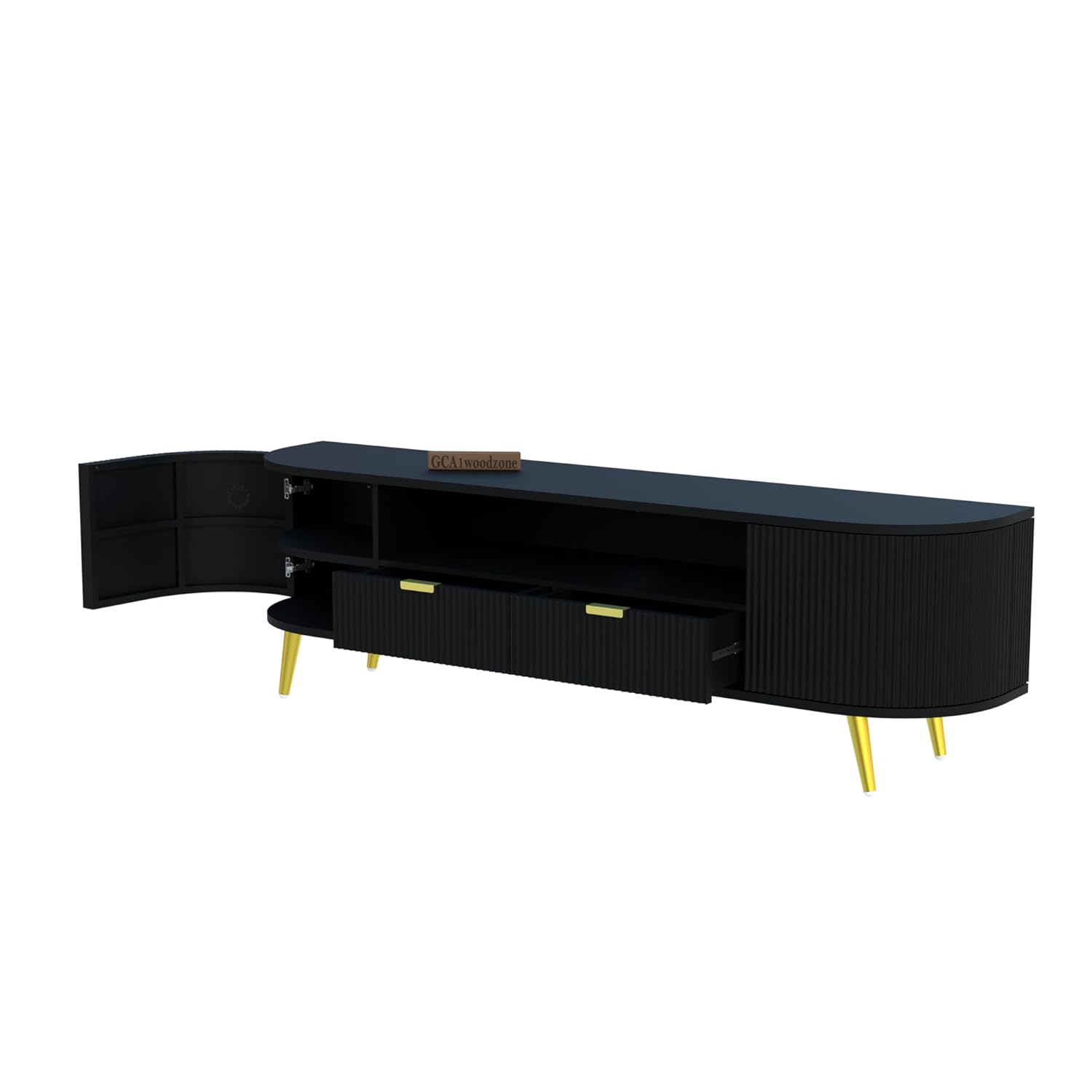 This GCA1 WOODZONE Wooden TV Unit is a modern and functional media console designed to enhance contemporary Indian living spaces. Crafted from premium HDMR wood and supported by sturdy iron legs, this free-standing TV cabinet offers excellent durability, stability, and a refined modern look. The elegant black finish adds a bold and sophisticated touch, making it a perfect fit for living rooms, drawing rooms, and home offices.