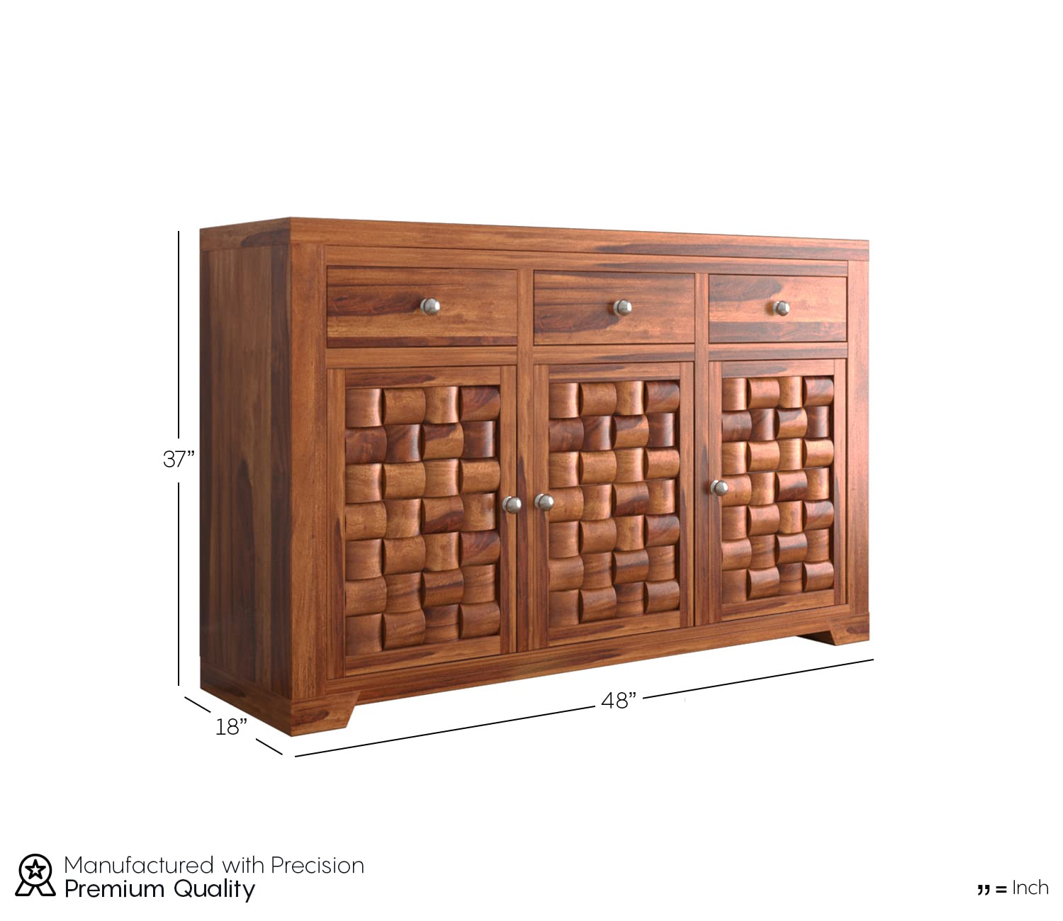 This Solid Sheesham Wood Sideboard Cabinet features three doors and three drawers in a honey finish. Designed in the Niwar style, it offers durable, spacious storage for living rooms, offices, and lounges.
