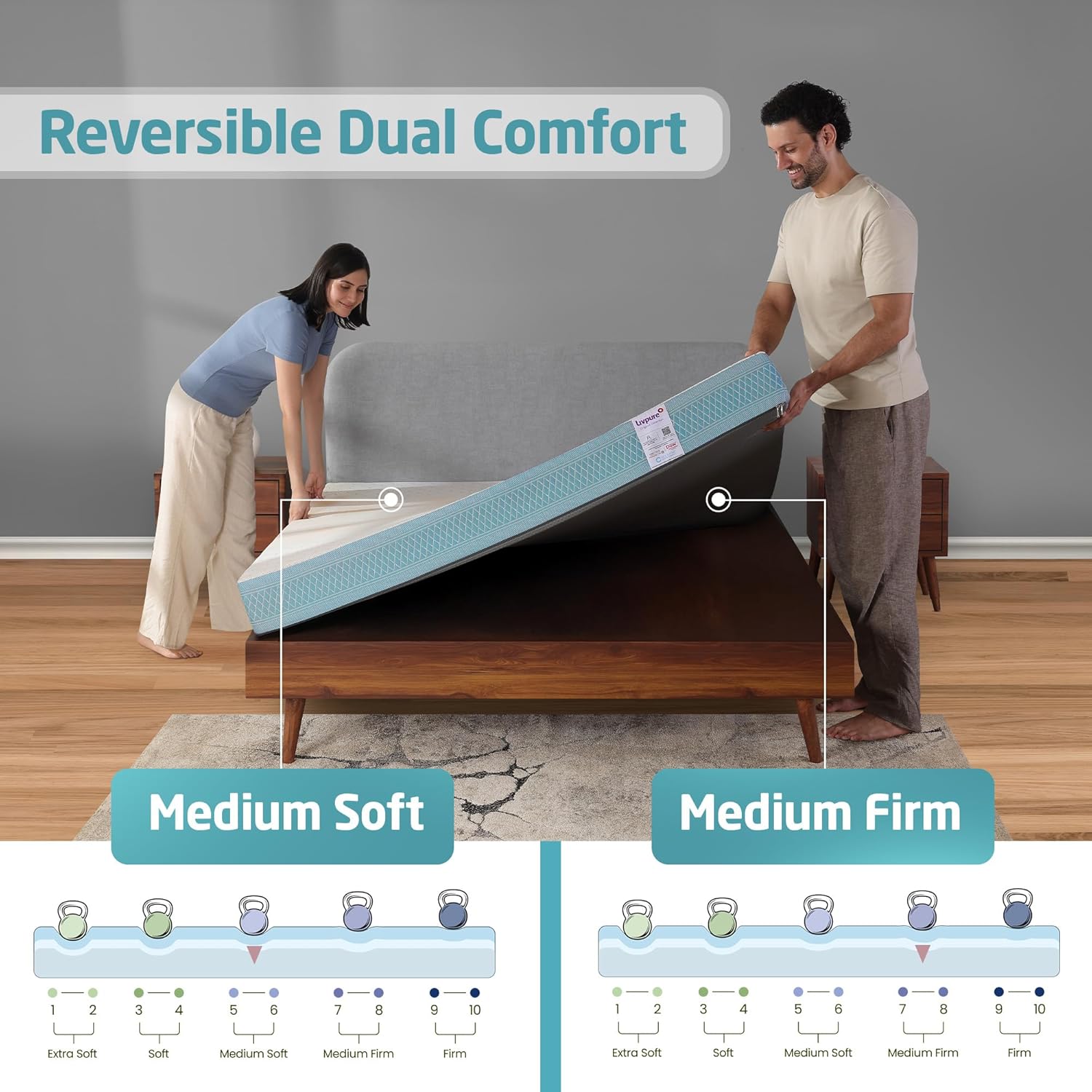 This king size mattress from Livpure Smart offers reversible dual comfort with hr foam mattress layers, making it the best mattress for back pain and everyday sleep comfort for modern Indian homes.