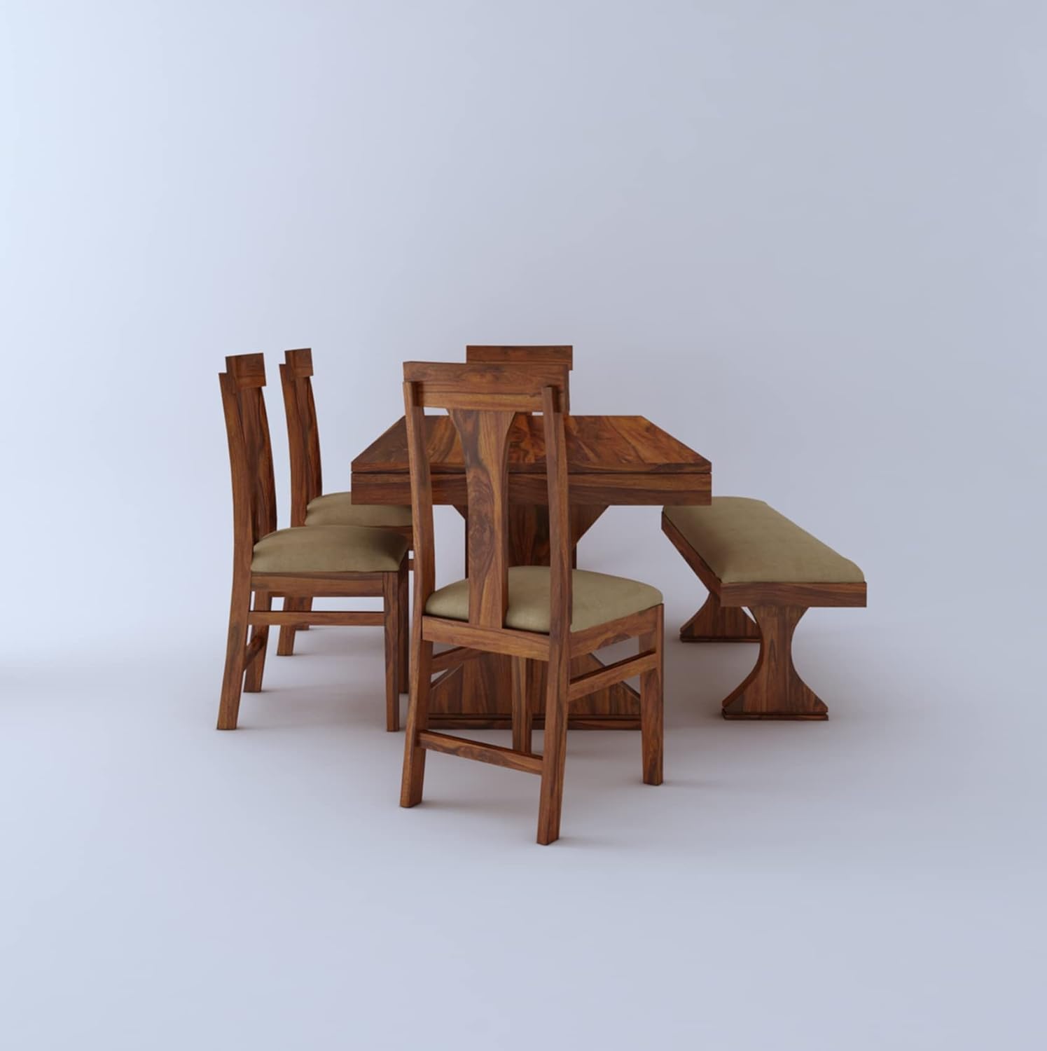 This dining set includes four well‑crafted cushioned chairs and a sturdy bench, allowing you to enjoy the versatility of a thoughtfully designed 6 seater dining table with bench. The bench not only adds to the aesthetic charm but also provides smart seating flexibility, especially for compact spaces. Each seating element features premium cushioning that ensures long-lasting comfort, making long dinner conversations much more enjoyable. Skilled artisans from Ganpati Arts carefully finish every detail, ensuring that each piece reflects exceptional craftsmanship and superior reliability.