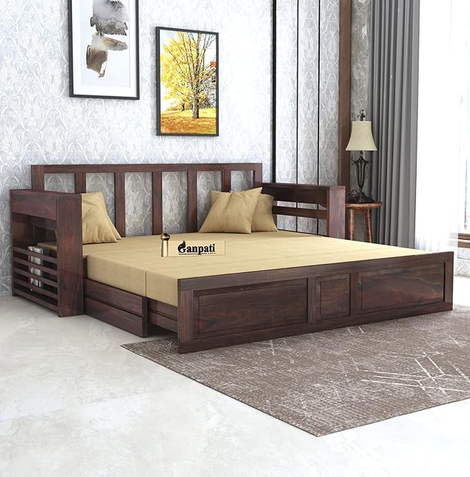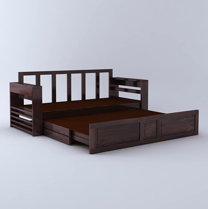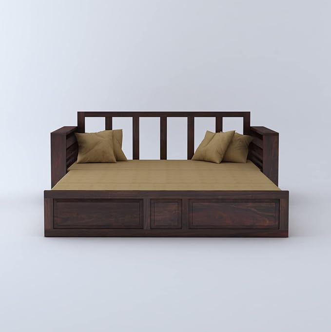 The sofa bed by Ganpati Arts is crafted to bring elegance, comfort and long-lasting durability to your living space. Made from premium solid sheesham wood, this multifunctional furniture piece is designed to complement modern living while offering strength and superior craftsmanship. The warm walnut finish enhances its natural wood grain, making it a timeless addition to your living room or bedroom. Whether you’re furnishing a compact apartment or upgrading your home décor, this wooden sofa cum bed delivers both style and practicality in one smart design.