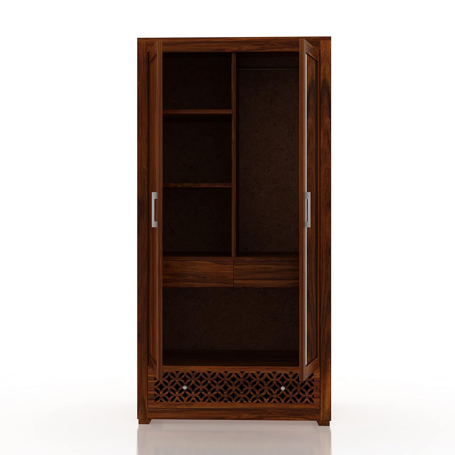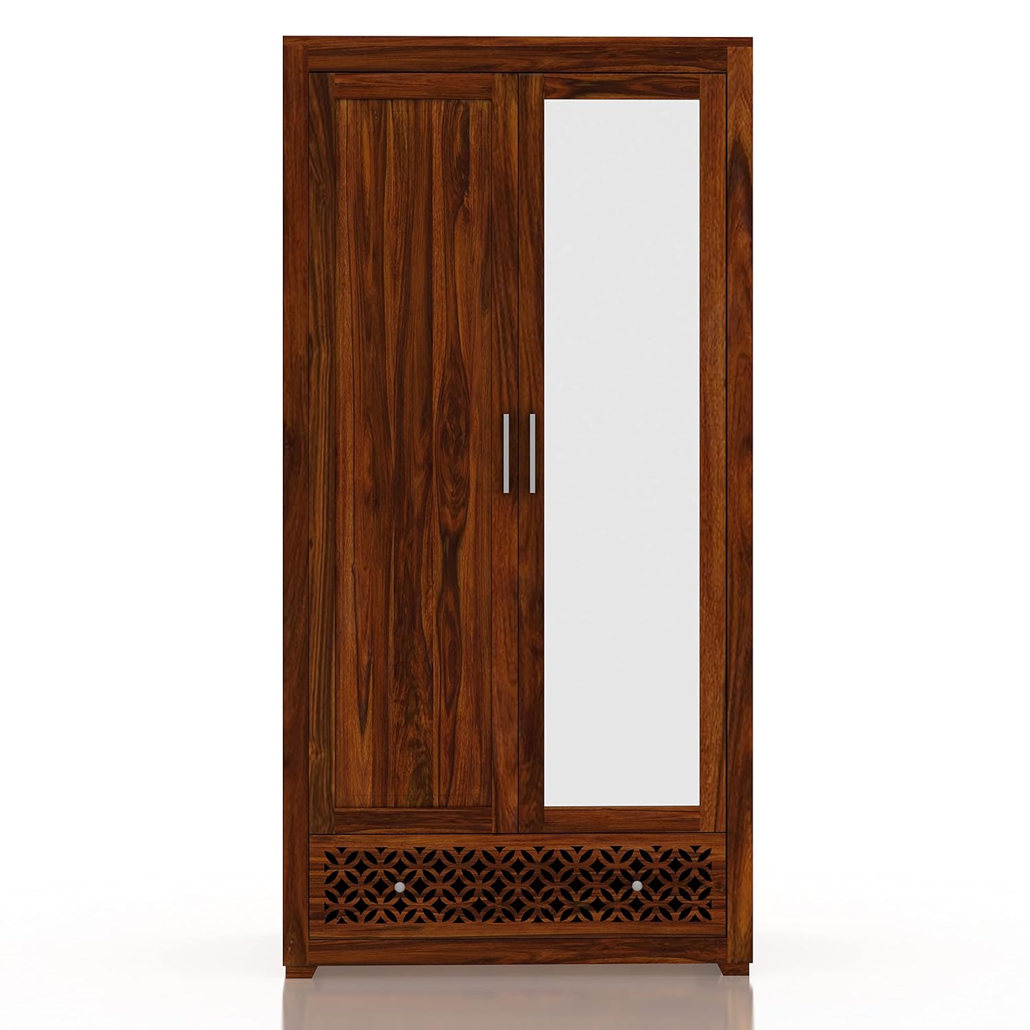 Designed for everyday functionality and long-lasting use, this wooden wardrobe with drawer from Ganpati Arts is crafted using premium solid Sheesham wood. Built with a durable structure, this wardrobe with 1 drawer offers dependable storage while maintaining its strength and finish over time. Its compact proportions make it a practical choice for modern Indian homes where space and organisation matter.The smooth drawer and well-designed storage space make this wardrobe with drawer suitable for storing clothing, household essentials, or crockery. Finished in a natural tone, this compact wooden wardrobe blends effortlessly with contemporary interiors while pairing well with a wooden Queen size bed, solid wood Queen size bed, or other wooden furniture pieces in the bedroom.With its clean lines and sturdy construction, this bedroom wardrobe with drawer reflects the appeal of modern furniture while retaining the warmth of natural wood. Whether placed in a bedroom, dining area, or living space, it complements a modern Queen size bed, wooden bed, or bed setup, creating a cohesive and organised interior. Thoughtfully crafted for daily Indian living, this unit delivers durability, style, and practical storage in one reliable piece.